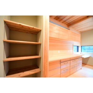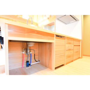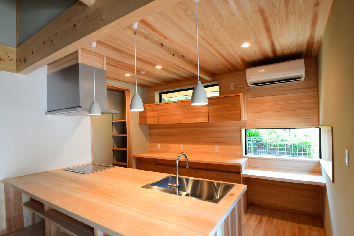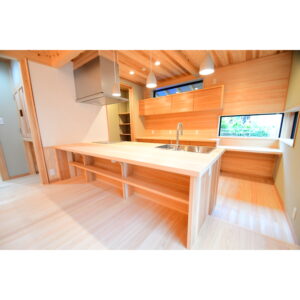 無垢材を用いた造作により、温かみのある質感と耐久性を兼ね備えた、機能性とデザイン性を両立した造作キッチンが完成しました。