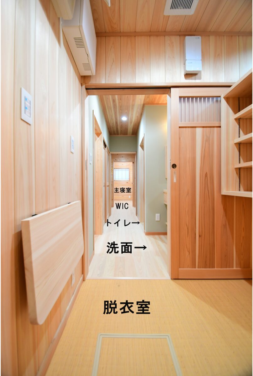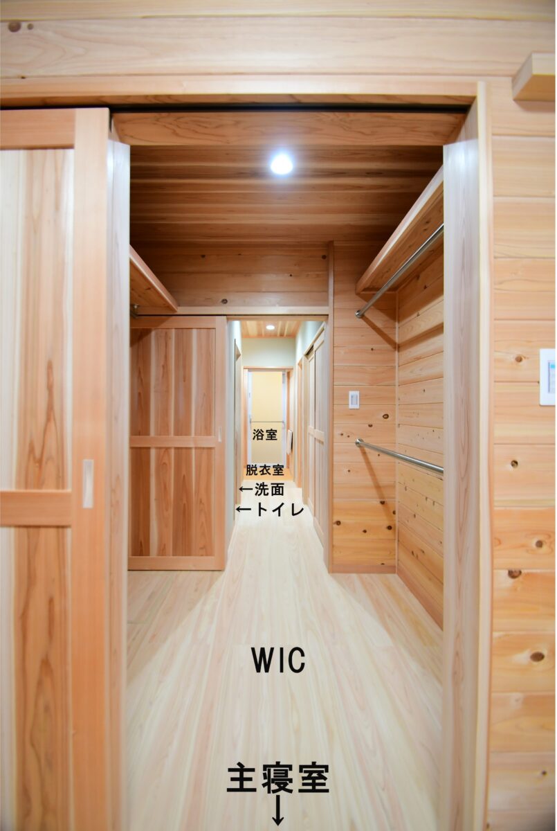 主寝室からは、ウォークインクローゼット(WIC)→廊下(トイレ・洗面スペース)→脱衣室→浴室へと、一直線に続く動線となっています。