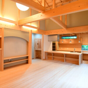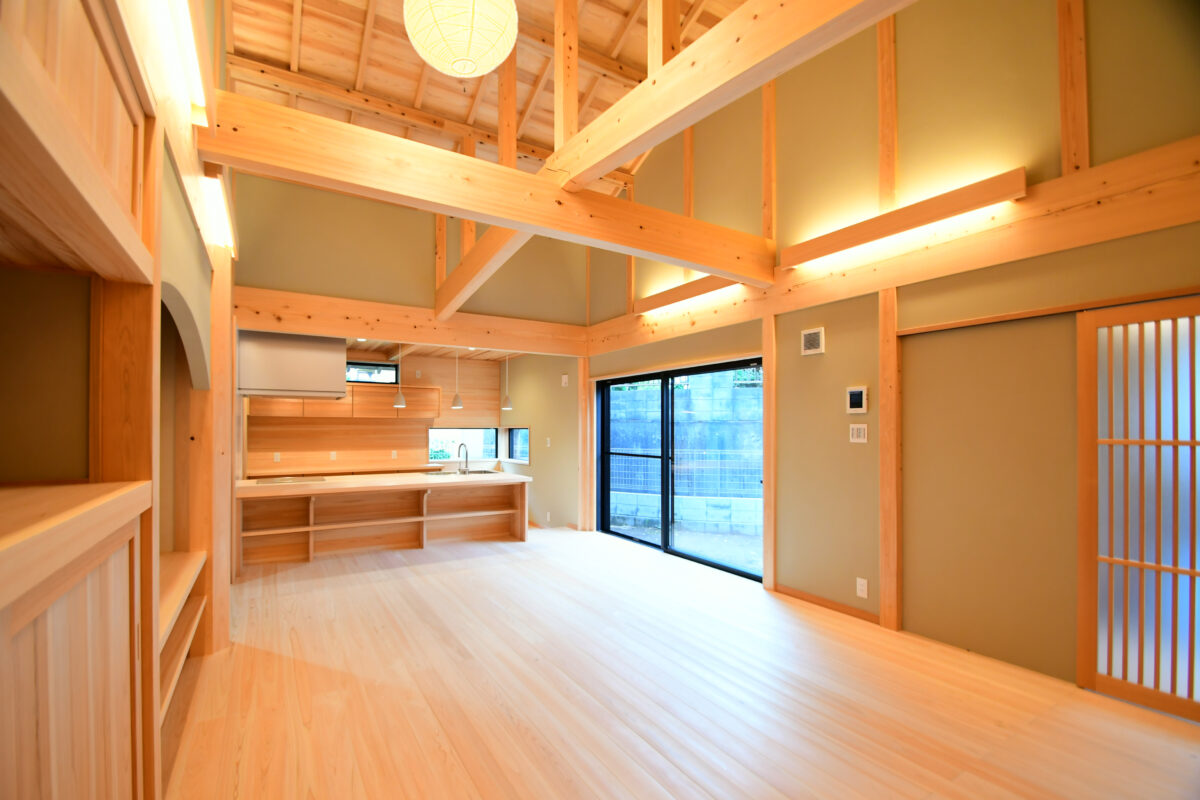 リビングは太鼓梁を現しとし、架構を意匠として活かした大空間設計。