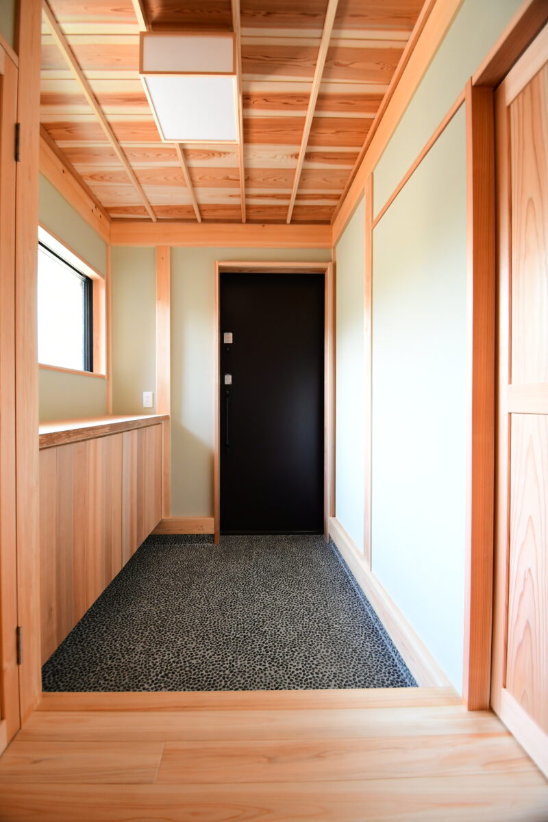 木のあたたかさと、日本の伝統的な仕上げを取り入れた玄関。