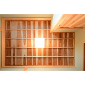 木組みを柔らかく照らし出す光は、昼間の自然光と夜の照明とで異なる表情を演出し、構造美と素材美を一層際立たせています。