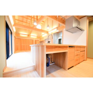 また、キッチン側の床を一段下げるスキップフロア構造とすることで、カウンターにいる家族との視線が自然に合いやすいよう計画。