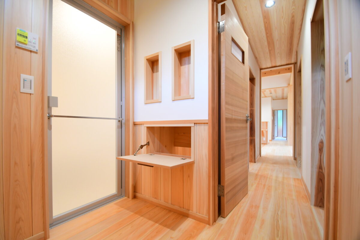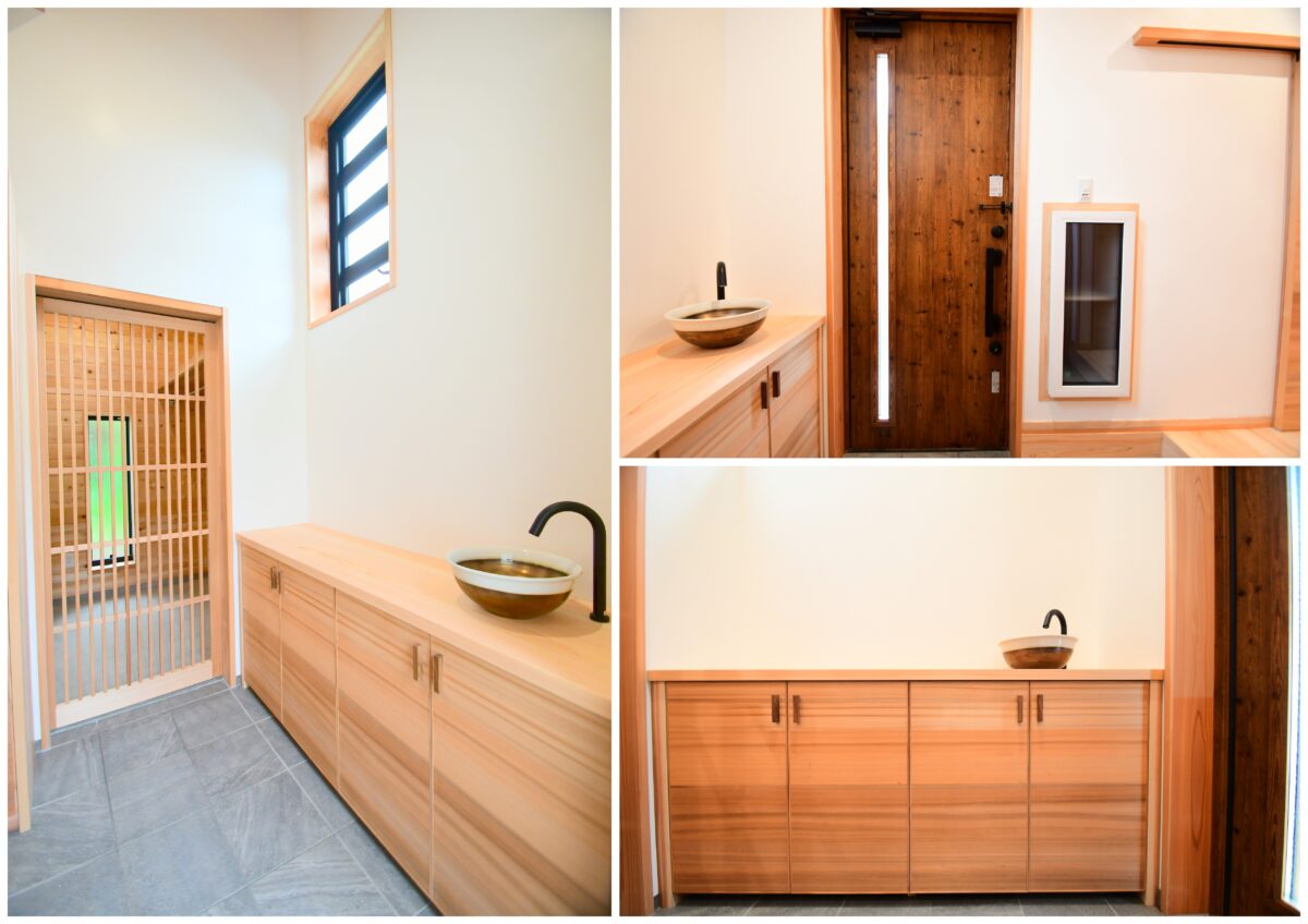 玄関正面には靴収納の上に手洗い鉢を設置。